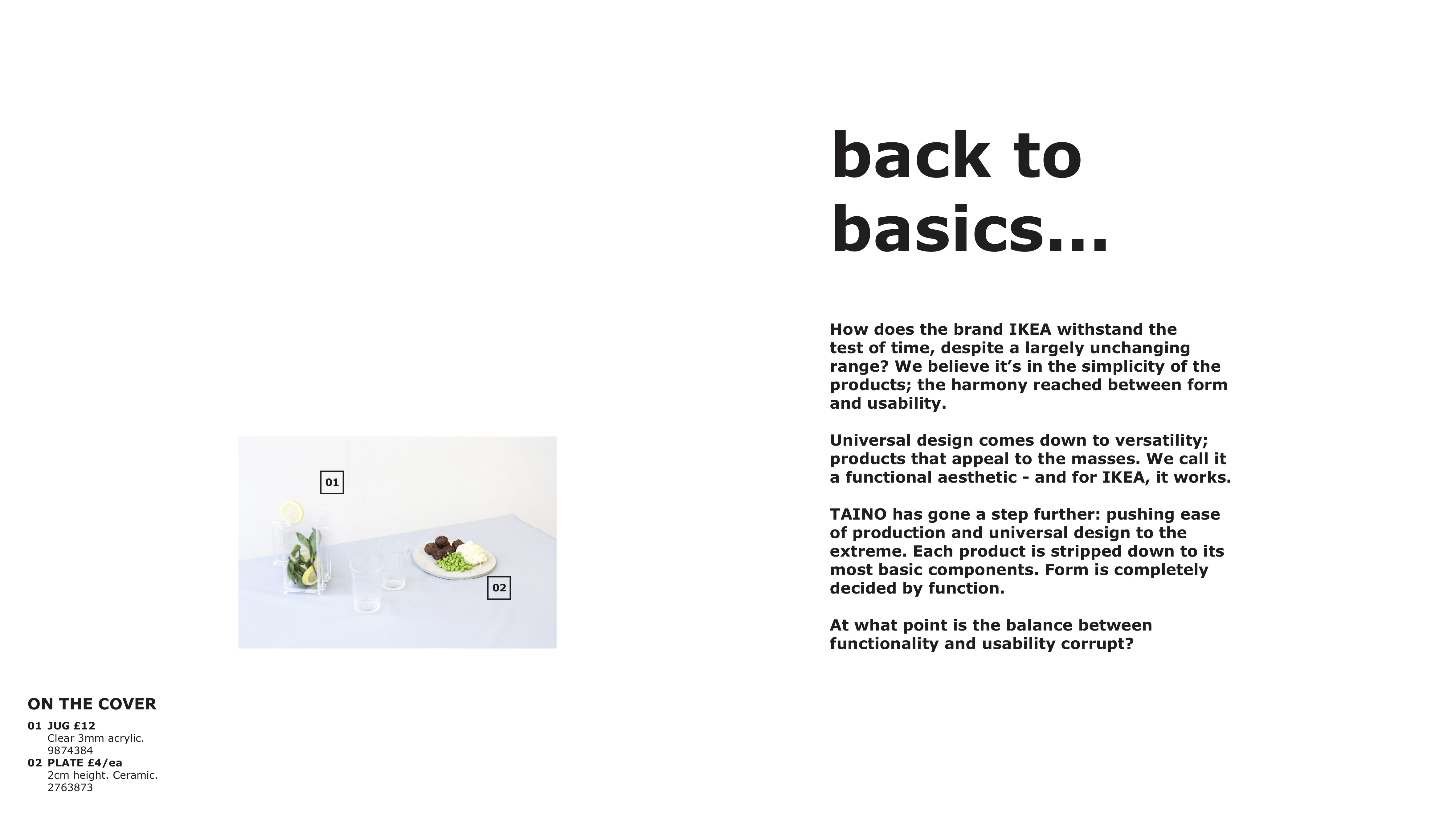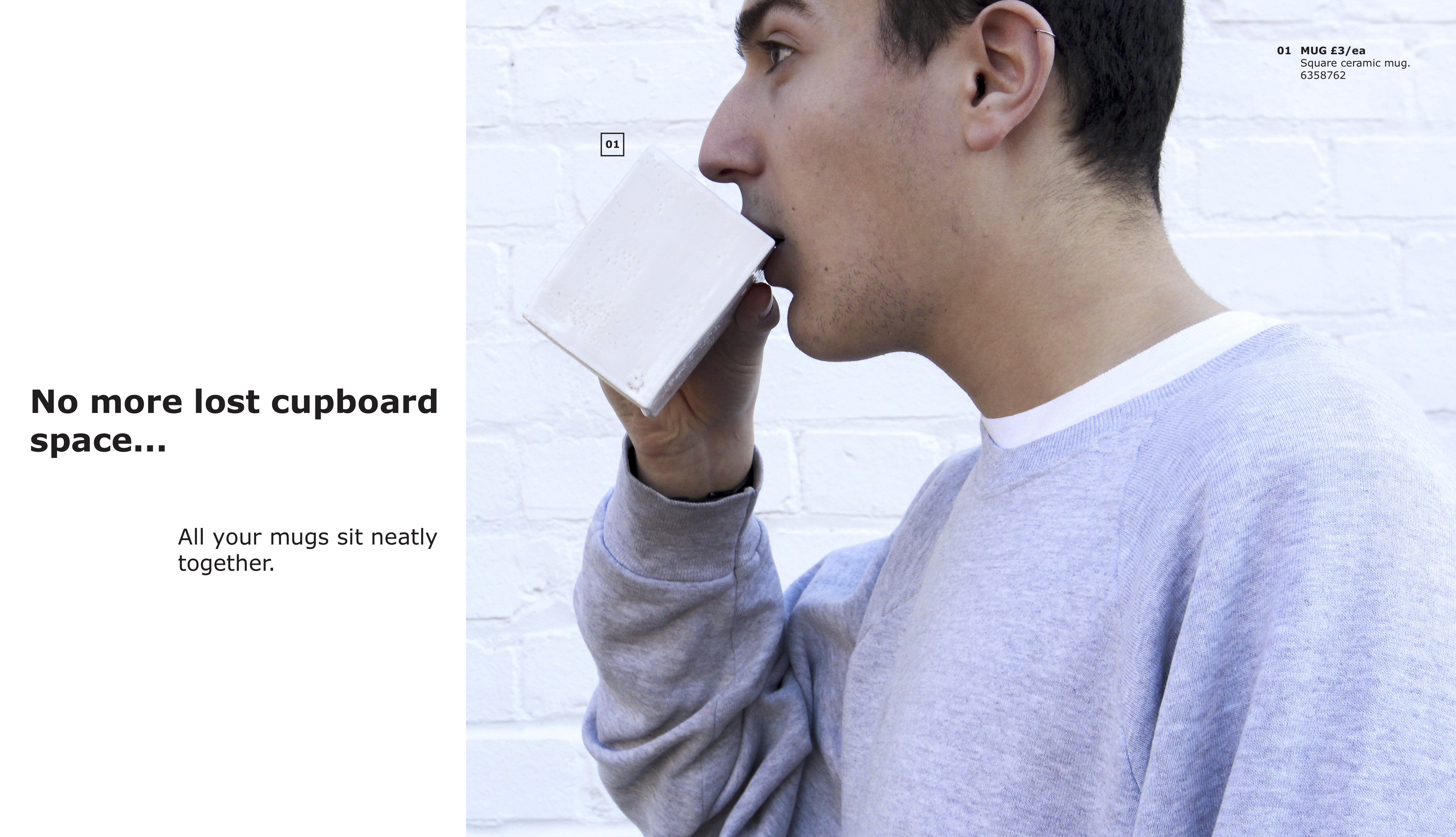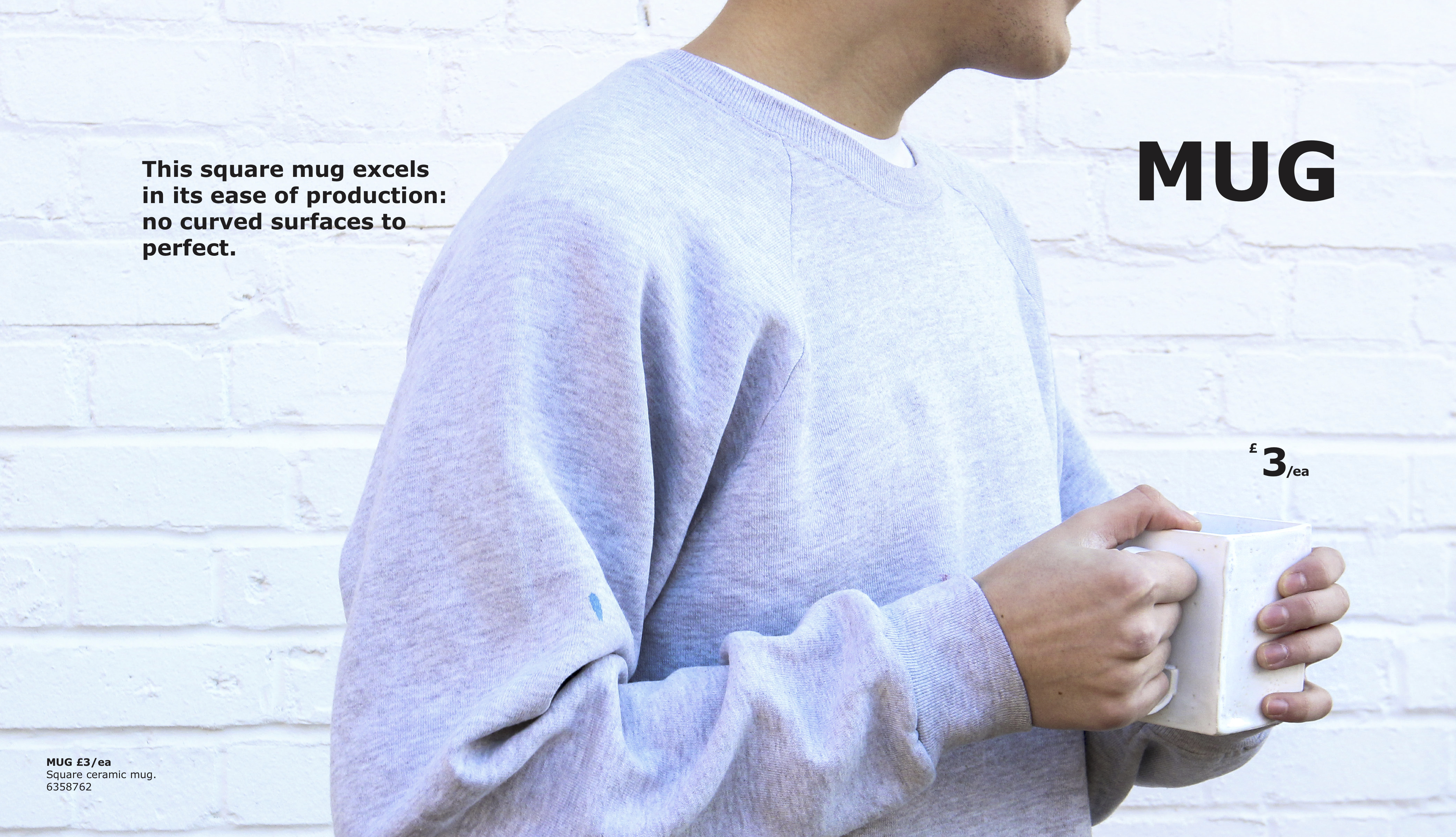 Pushing IKEA’s neutral aesthetic to the extreme. TAINO’s flat-pack jug square mug and rimless plate are “loved by all”- but as a result of their simplicity, completely dysfunctional.