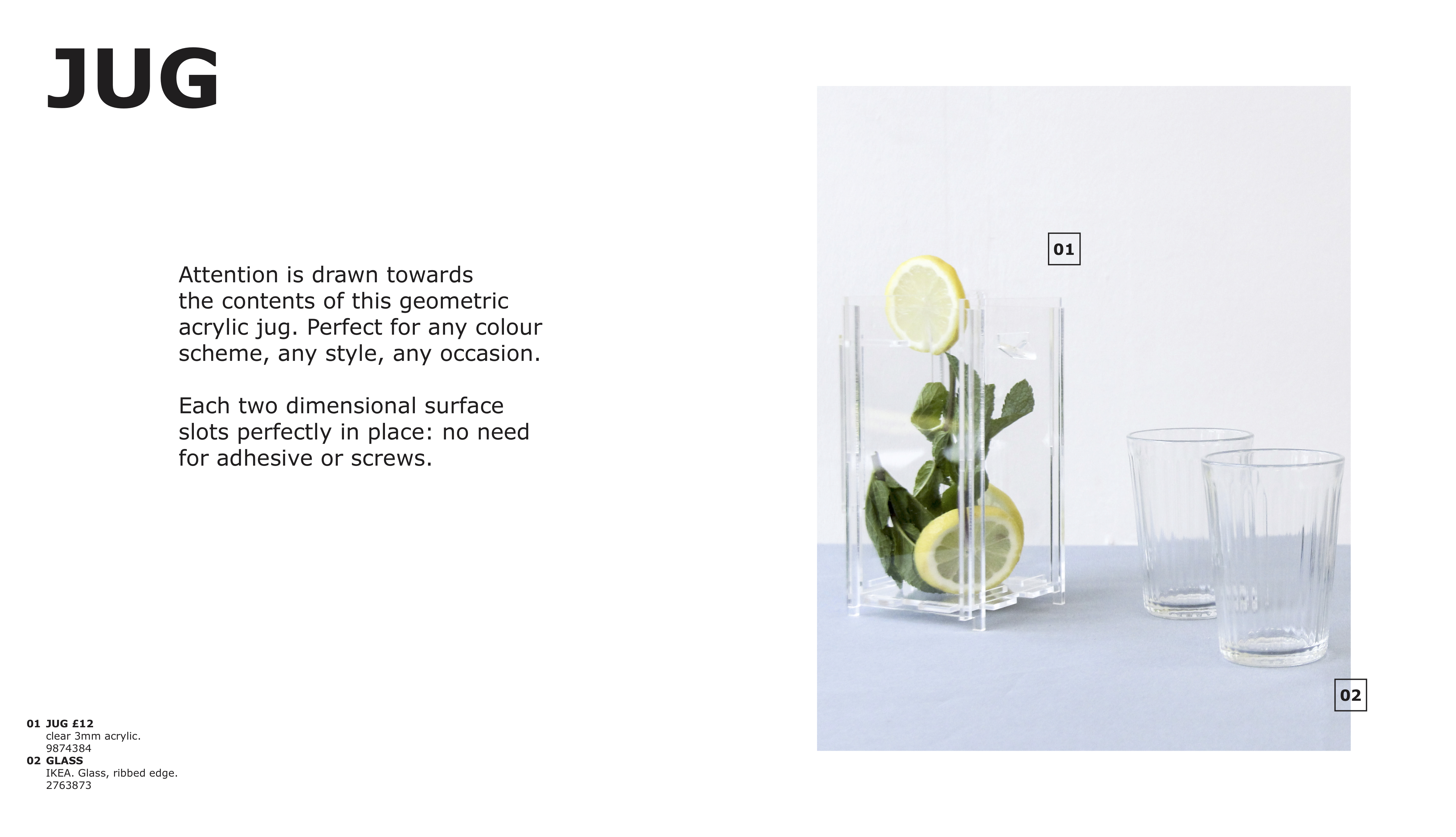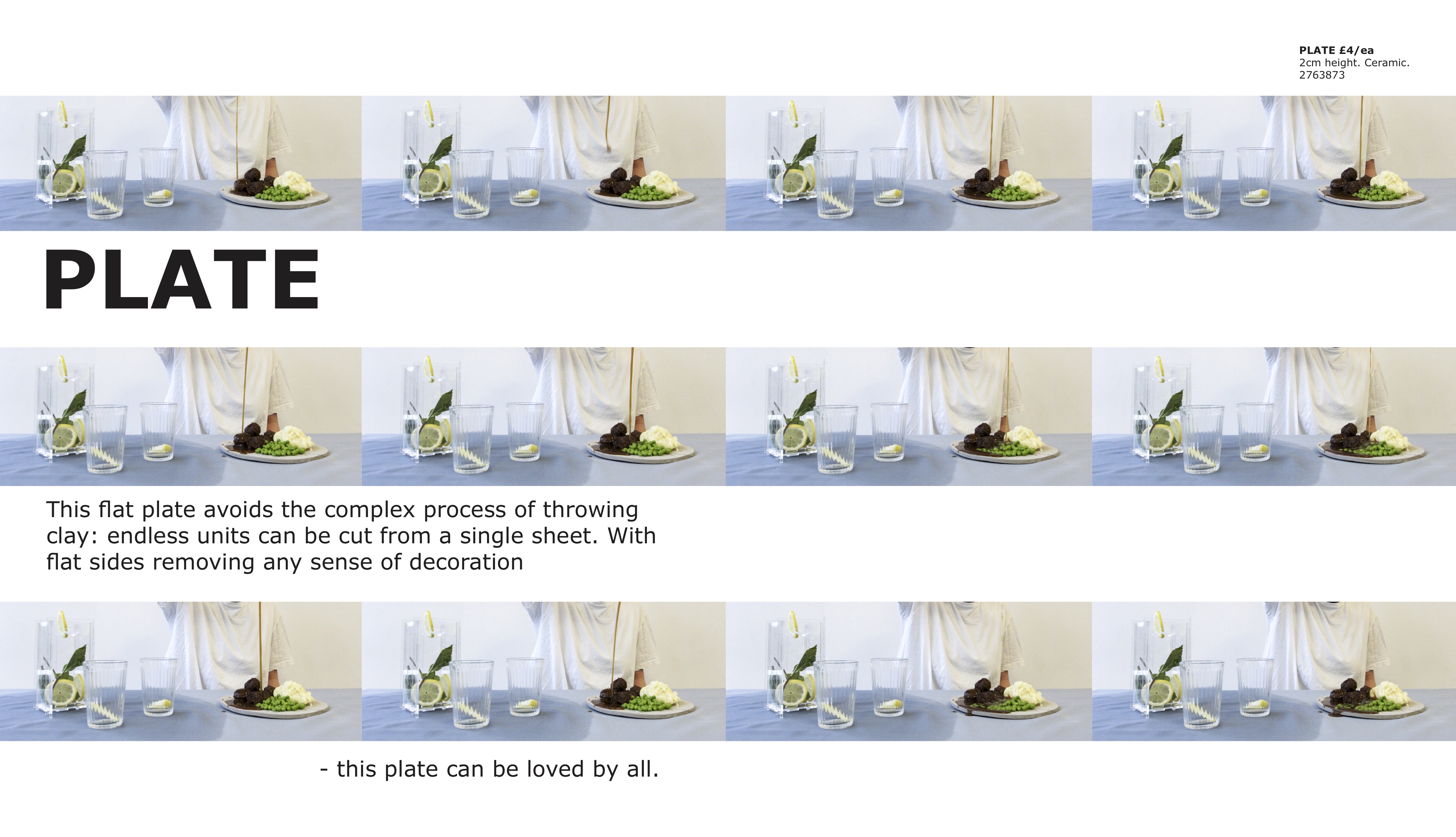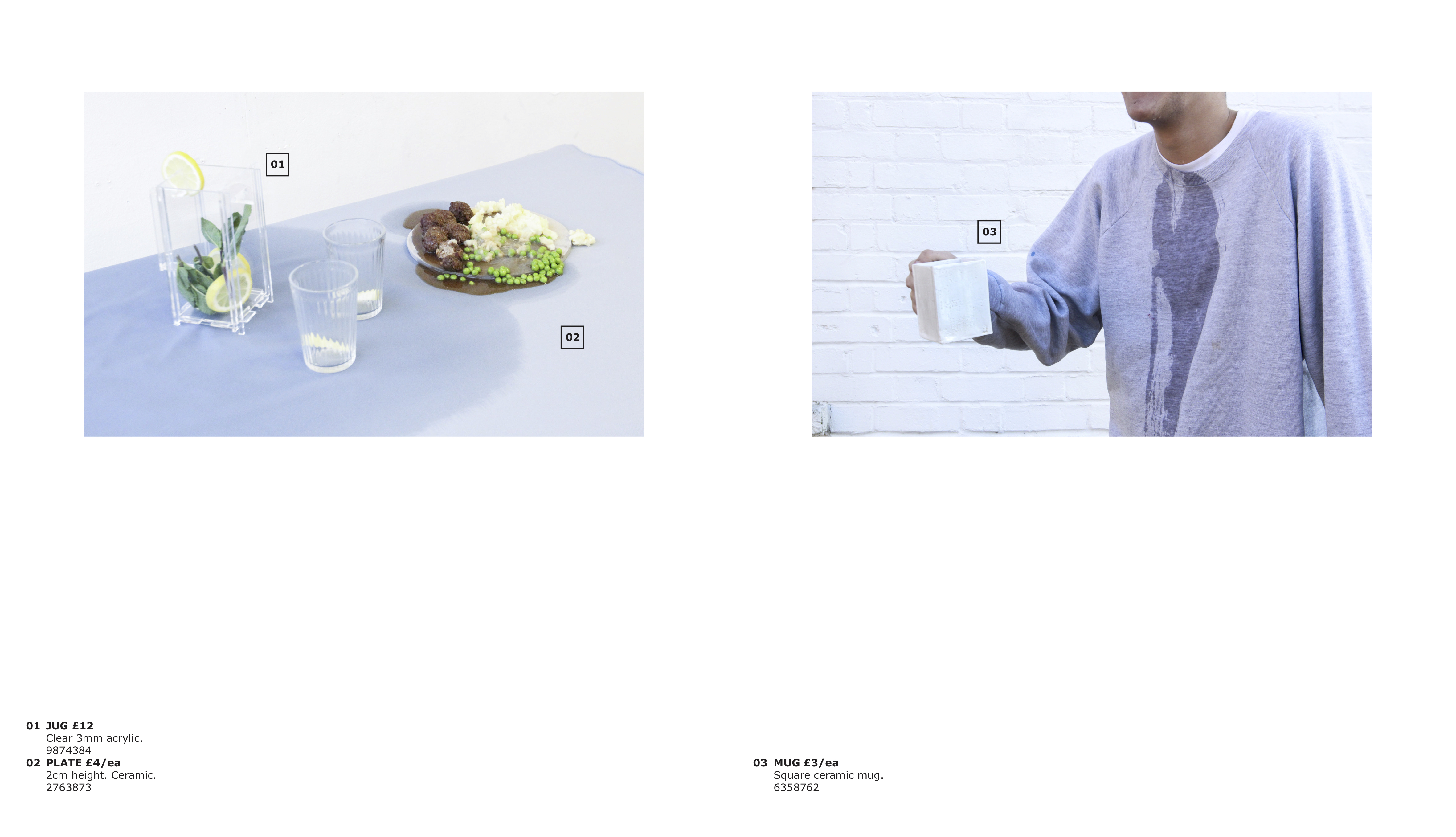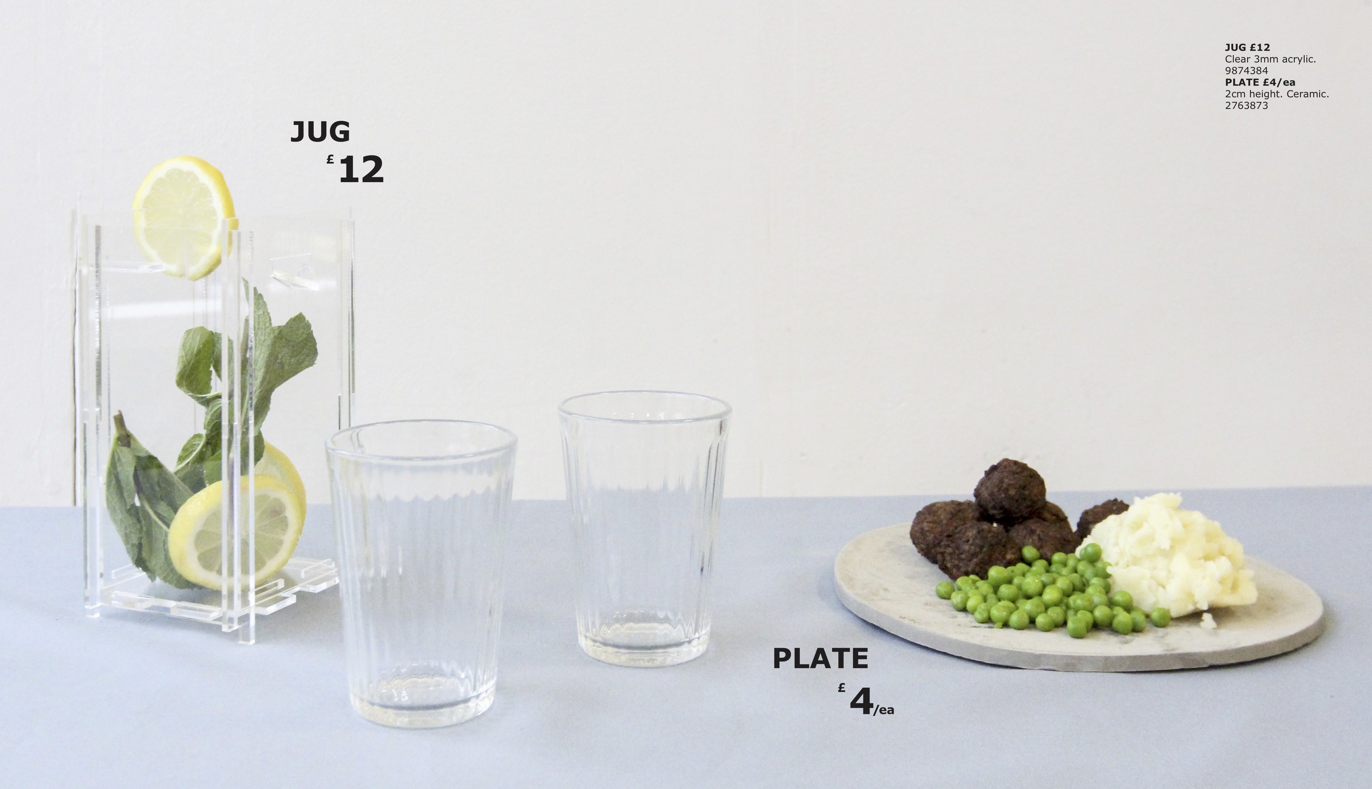 Pushing IKEA’s neutral aesthetic to the extreme. TAINO’s flat-pack jug square mug and rimless plate are “loved by all”- but as a result of their simplicity, completely dysfunctional.